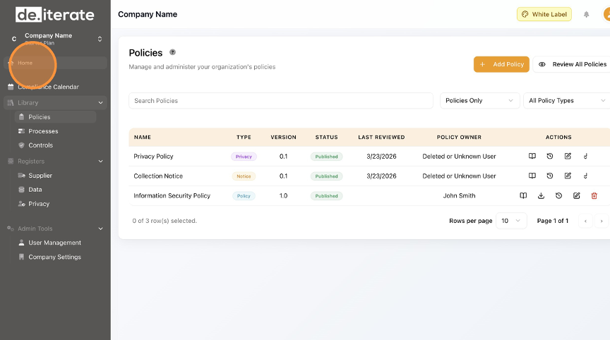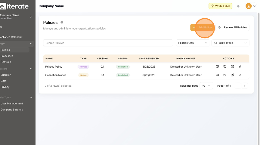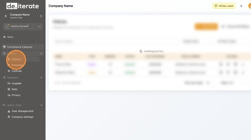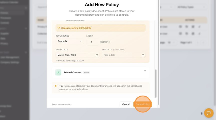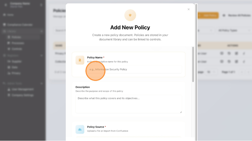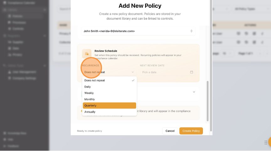 Learn how to add a new Policy within de.iterate. This guide walks you through adding a policy, defining its name and description, and configuring a review schedule.