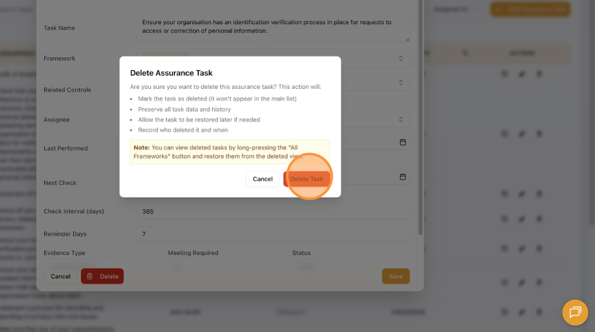 Follow these simple steps to successfully delete a task within the Compliance Calendar. This guide will walk you through navigating to the task, confirming its deletion, and returning to the dashboard.